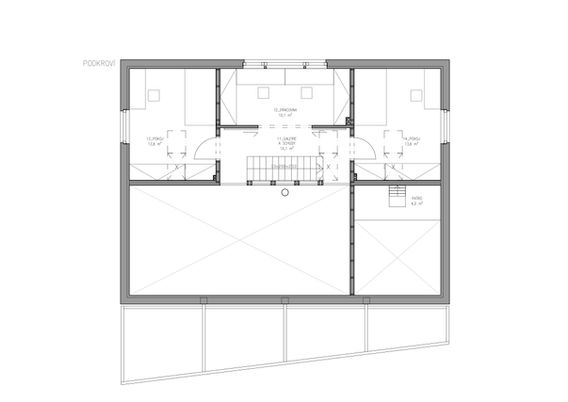 Dům má konstrukci z CLT panelů, která elegantně řeší statiku i estetiku. V interiéru kombinuje krásu s odolností a zabírá minimum plochy. V kompaktní hmotě se ukrývá dispozice 6+kk s převýšeným obytným prostorem, postaveným kolem centrálních kamen. Kombinací velkorysosti jedněch místností s kompaktností druhých, vešla se do domu i praktická spíž a velká technická místnost.